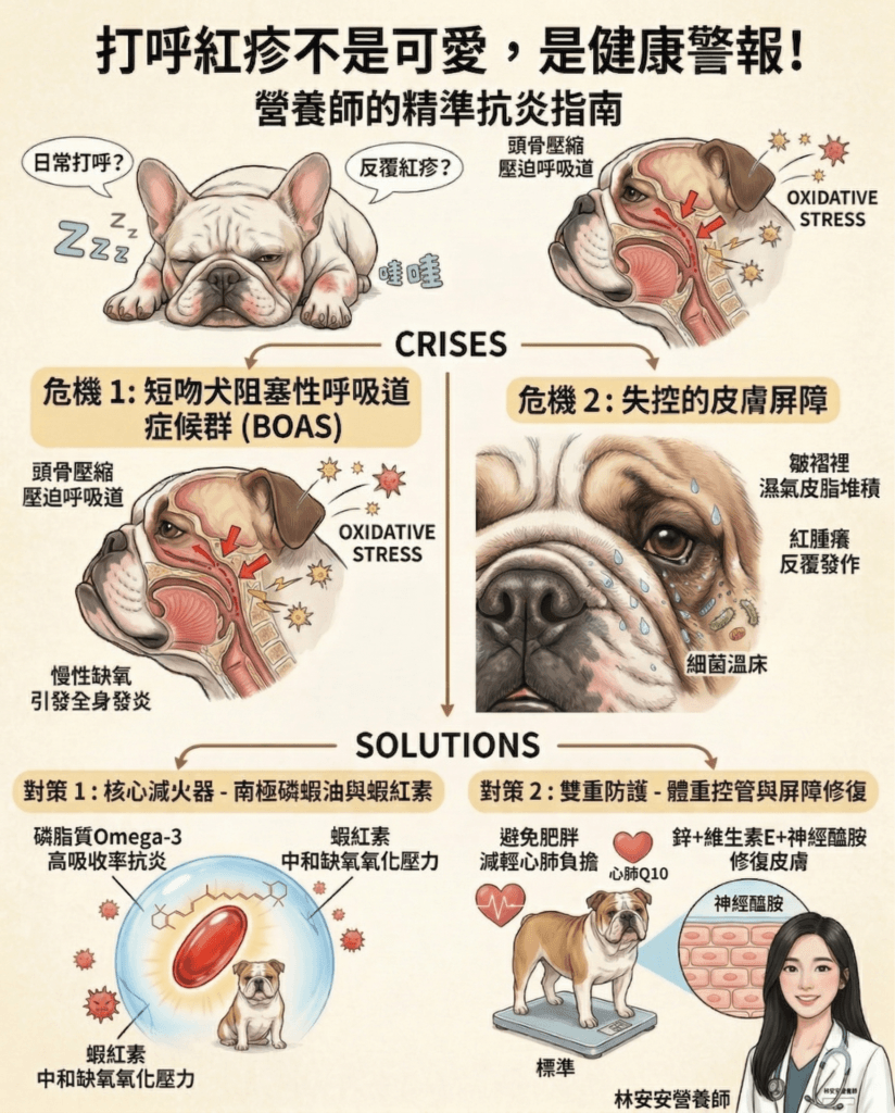 💡 林安安營養師點評: 鬥牛犬的皮膚病是由內而外的系統性問題。想要解決皮膚紅疹,得往源頭看向呼吸道缺氧問題——身體發炎指數升高,皮膚的免疫屏障就會跟著垮掉。除了外部的皺褶清潔與藥浴,必須透過精準的營養調養,才能真正中斷皮膚反覆發炎的惡性循環。