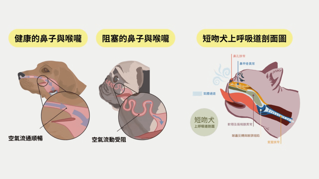 鬥牛犬是典型的短吻犬種。頭骨扁平內縮,但內部軟組織卻沒有等比例縮小,進而造成上呼吸道壓迫阻塞,極易罹患短吻犬阻塞性呼吸道症候群(1)(BOAS)。
