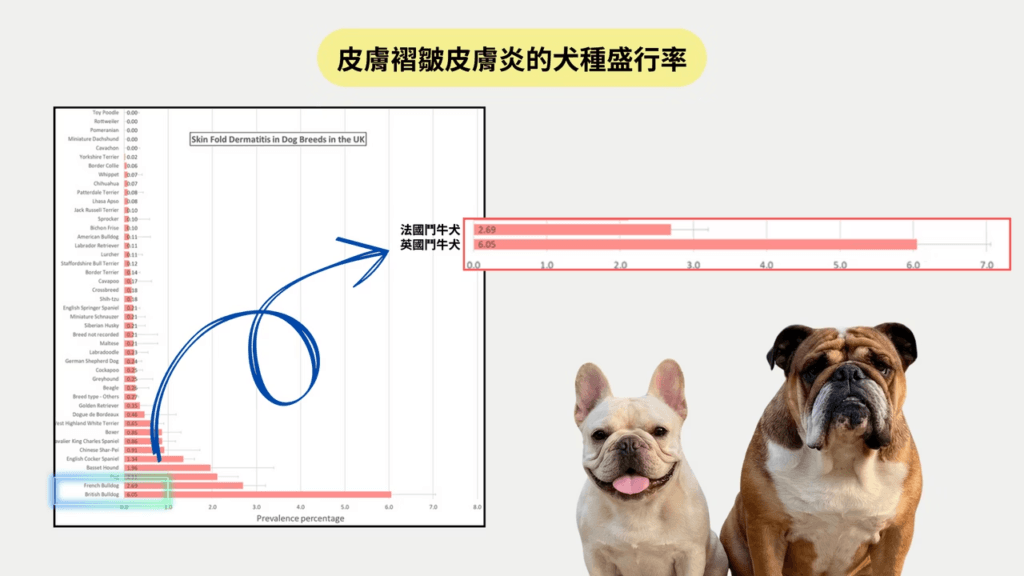 為了配合短小的頭骨,鬥牛犬的臉部與尾部呈現多層次且深層的皮膚皺褶。根據英國大型流行病學統計,英國鬥牛犬與法國鬥牛犬的「皮膚褶皺皮膚炎」發病率遙遙領先其他犬種(4)。