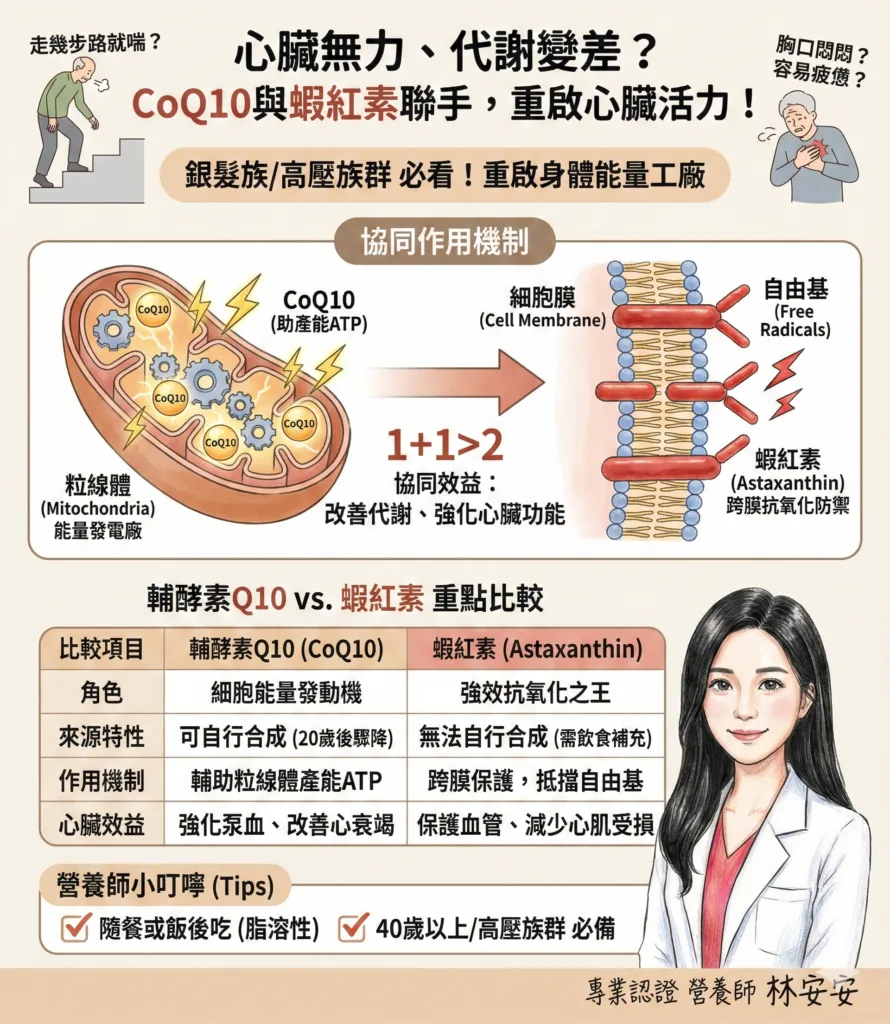 研究指出,將輔酵素Q10 (CoQ10) 與蝦紅素 (Astaxanthin) 等抗氧化營養素結合,或許能產生「協同作用」,能改善代謝、強化心臟功能的關鍵策略。