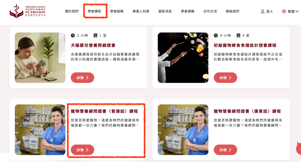 點選香港寵物營養學會官網上>>學會課程