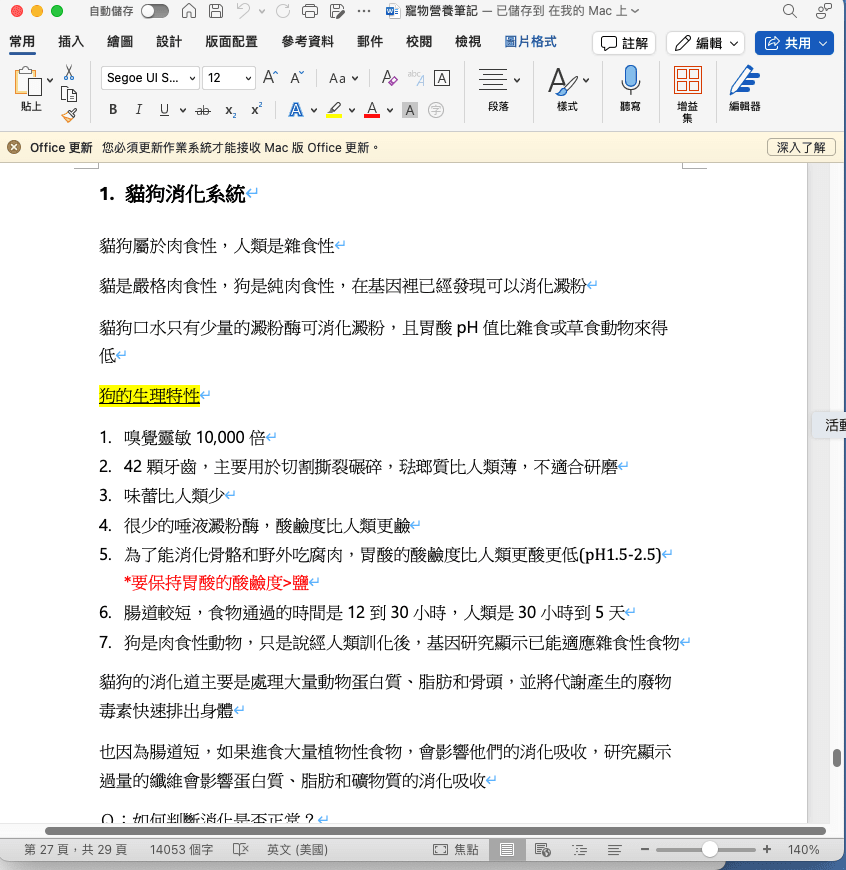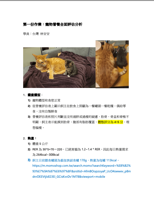 主要是作業的部分複雜度很高,尤其是第二和第三部分…..八週的寵物營養問卷紀錄很快,但要另外花時間做詳細評估分析和照片整理,我每份至少有近十頁的內容,燒腦耗時