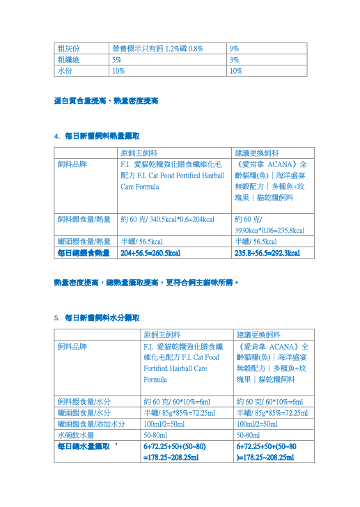 2)建議更換飼料或罐頭後,追蹤寵物貓狗的情況,每週做一次寵物營養全面評估分析(寵物健康問卷前測,針對牠的狀況寫一份PDF檔評估分析+寵物體態、糞便尿液照片),追蹤換食候的變化共八週的時間